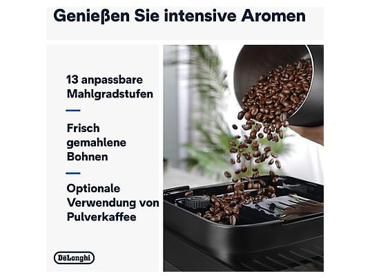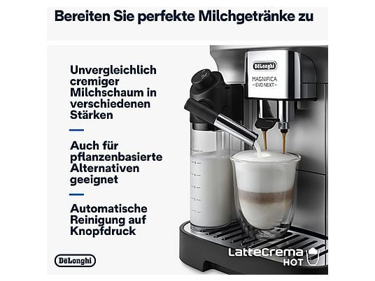Magnifica Evo Next verkörpert die langjährige Erfahrung und das technische Know-How von De'Longhi mit dem Anspruch auf perfekten Kaffeegenuss. Immer frisch gemahlen und perfekt aufgebrüht. Der De‘Longhi Kaffeevollautomat bedient jeden Kaffeegeschmack mit einem benutzerfreundlichen Bedienfeld, auf dem farbige Icons, ein farbiges TFT-Display und Navigationstasten den Benutzer in eine Welt von Kaffeegetränken führen, die vollständig personalisierbar sind. Sie können die Parameter Ihrer Getränke ganz einfach einstellen, indem Sie zwischen 5 Tassen-Größen, 4 Intensitätsstufen und 3 Temperaturoptionen wählen. Mit der My-Funktion können Sie die Menge noch individueller gestalten. Nachdem Sie Ihre Getränke angepasst haben, können Sie sie in Ihren Profilen speichern, sodass die Maschine Sie und Ihre Vorlieben kennt. Das LatteCrema Hot Milchsystem sorgt für einen dichten Milchschaum mit der perfekten Temperatur für all Ihre Milchgetränke.